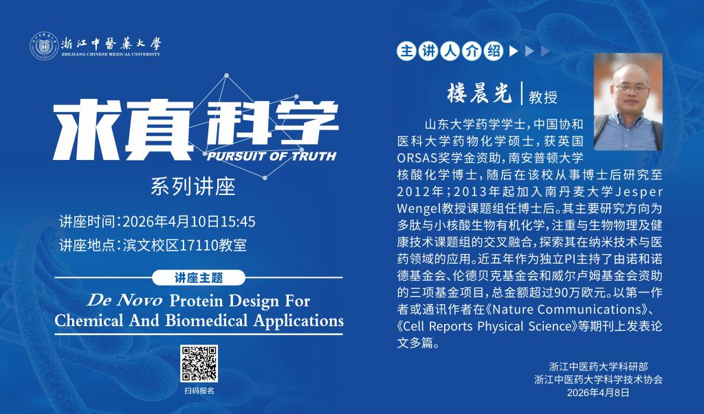 主讲人简介:楼晨光教授,山东大学药学学士,中国协和医科大学药物化学硕士,获英国ORSAS奖学金资助,南安普顿大学核酸化学博士,随后在该校从事博士后研究至2012年;2013年起加入南丹麦大学Jesper Wengel教授课题组任博士后。其主要研究方向为多肽与小核酸生物有机化学,注重与生物物理及健康技术课题组的交叉融合,探索其在纳米技术与医药领域的应用。近五年作为独立PI主持了由诺和诺德基金会、伦德贝克基金会和威尔卢姆基金会资助的三项基金项目,总金额超过90万欧元。以第一作者或通讯作者在《Nature Communications》、《Cell Reports Physical Science》等期刊上发表论文多篇。