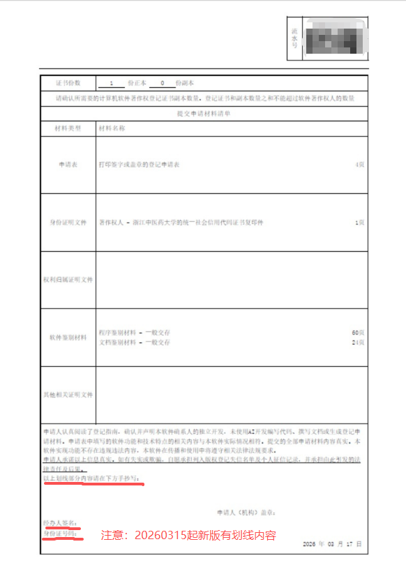 ①《提交申请材料清单》(系统生成,右上角有条形码,示意图见下图)一式3份(下方“申请人签章”是学校盖章,个人请不要签字),学校盖章后需要上传到软著系统再在线递交;